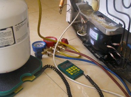 - Холодильник заправляется фреоном. На этом этапе мастер заправляет систему хладагентом подходящей для данной марки и модели холодильника маркировки. Баллон с хладагентом через клапан Шредера подключается к агрегату, а затем открывается вентиль на баллоне. Заправка осуществляется по массе или по давлению. В первом случае баллон с фреоном помещается на весы, и мастер отмеряет необходимое количество хладагента по массе. Во втором – баллон соединяется с холодильником через манометр, с помощью которого специалист и контролирует уровень давления фреона в системе.